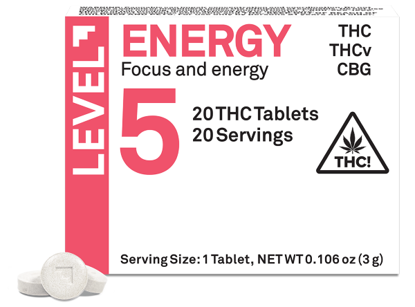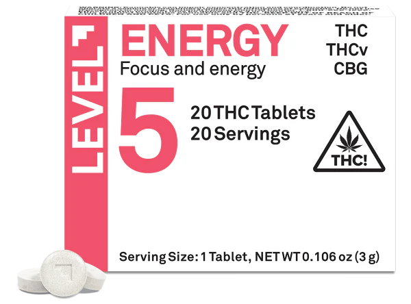 Tired of sugary gummies and messy edibles that leave you feeling sluggish? LEVEL 5 Energy tablets are here to revitalize your day. Each tablet combines the power of 5 mg delta-9 THC, 5 mg of THCv, and 3 mg of CBG in a precisely formulated blend designed to deliver clean, focused energy and help you conquer your to-do list. These highly effective, long-lasting tablets are sugar-free, gluten-free, vegan, and contain zero calories. Plus, they’re scored for easy splitting, so you can dial in your perfect dose every time. Simply swallow with liquid.