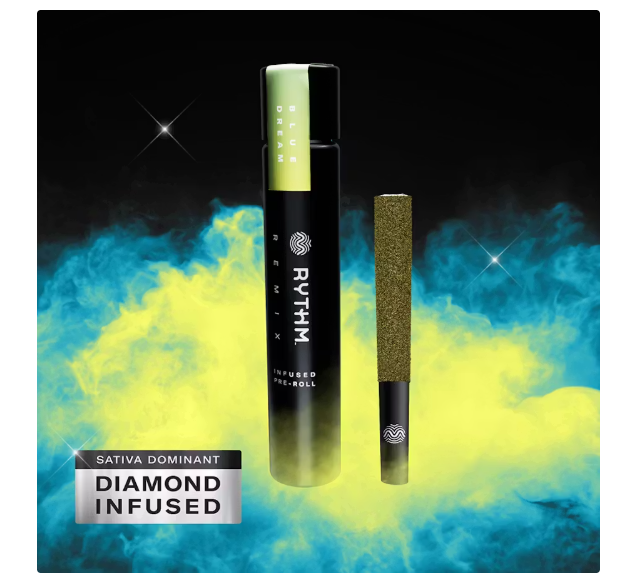 A sativa-dominant known to keep moods boosted, Blue Dream hits with a burst of sweet blueberry flavor. Remix pre-rolls feature RYTHM premium indoor flower double infused with THCa diamonds and kief for maximum potency and fine-tuned with 100% natural terpenes.