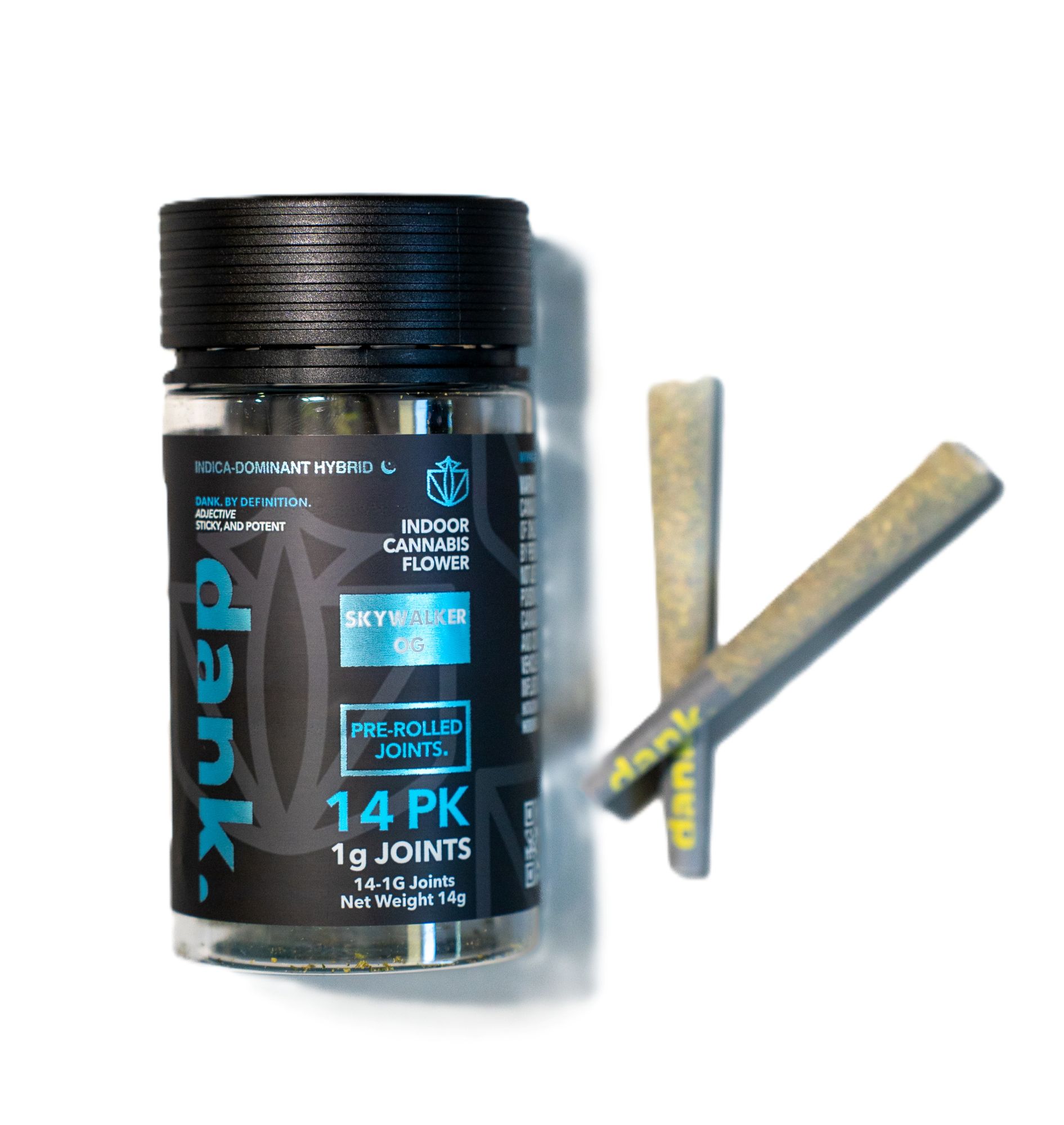 Elevate your smoking experience with our DANK Pre-Roll 14 Pack featuring Skywalker OG. This Indica-dominant hybrid, born from the union of Mazar and Blueberry OG, boasts high THC levels and a terpene profile rich in myrcene, caryophyllene, and limonene. Known for its deep relaxation and euphoric effects, Skywalker OG effectively alleviates stress, pain, and symptoms of anxiety and depression. Named after the iconic Star Wars saga, it offers a powerful escape to a galaxy far, far away. Savor the spicy, herbal essence with undertones of diesel and pine in each soothing yet invigorating draw. Experience the force of DANK's Skywalker OG pre-rolls.