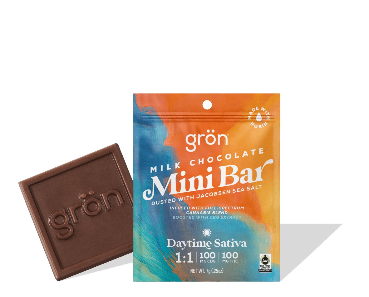 A daylight dose that’s easy to carry. Each Mini Bar is made of our handcrafted milk chocolate and infused with a 1:1 ratio of CBG and THC to add a little boost to your day.