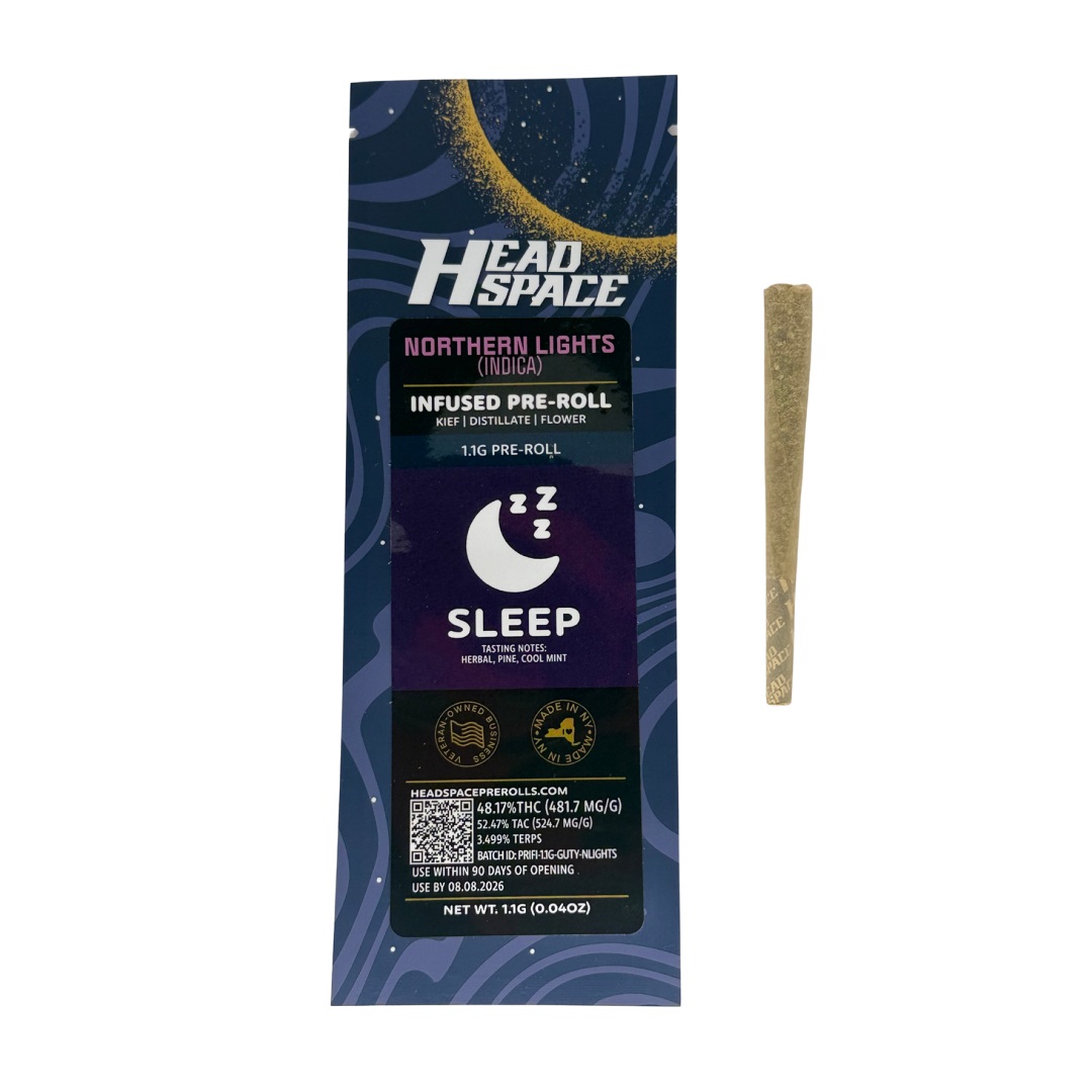 Northern Lights is a classic indica known for its herbal, pine, and cool mint notes. This Infused Preroll is built to melt away tension and guide you into restful sleep.