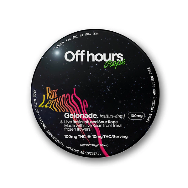Off Hours sour Razz Lemonade ropes are infused with Gelonade Live Resin for an uplifting, chatty high. Each rope is naturally flavored with sweet raspberry lemonade to complement lemony Gelonade.
