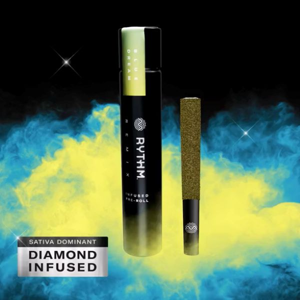 A sativa-dominant known to keep moods boosted, Blue Dream hits with a burst of sweet blueberry flavor. Remix pre-rolls feature RYTHM premium indoor flower double infused with THCa diamonds and kief for maximum potency and fine-tuned with 100% natural terpenes.